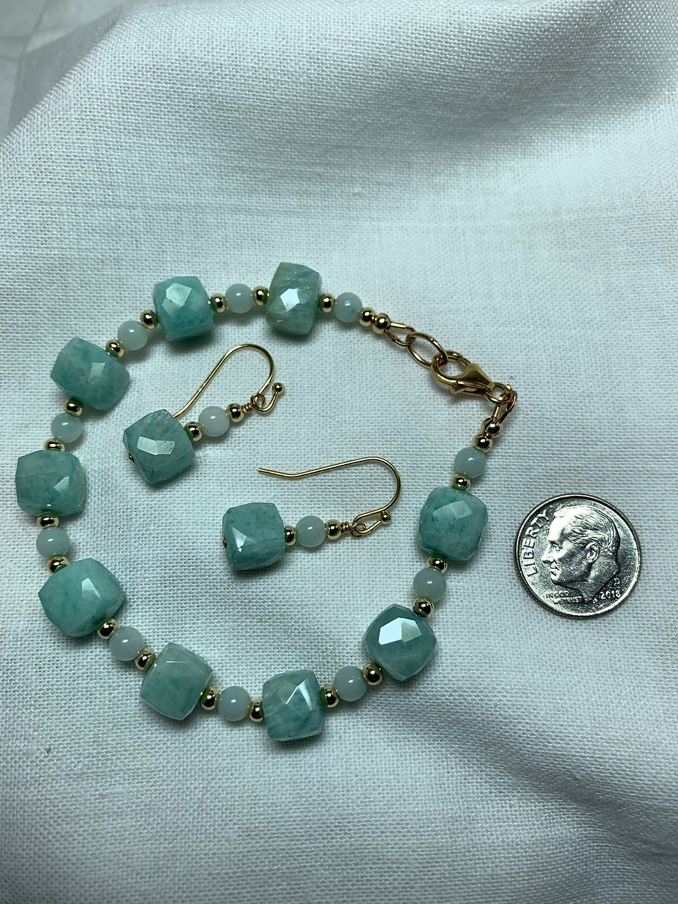 Stretch bracelet with a 25mm long by 10mm Tibetan etched agate and disk shaped 12mm wide by 5mm long amazonite. Accent beads are 7mm by 12mm donut shaped Peruvian opals, 8 mm etched Tibetan and faceted amazonite beads.